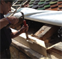 Charpente des combles : renforcement des chevrons-tirants des transepts et de la nef au moyen d’un sabot en bois sec et consolidation par l’installation de six tirants, afin d’éviter l'écartement de la charpente. |