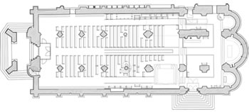 Le projet devrait opter pour une conservation du mobilier réalisé par Châtelain, en raison de son intérêt patrimonial, mais en le modifiant à son tour. Le nombre de places de bonne qualité visuelle et acoustique en serait considérablement augmenté. La distribution se ferait alors en périphérie de la nef, par les bas-côtés nord et sud. La disposition des bancs, avec un couloir central libre de toute place assise, demeurerait toutefois la disposition de base.